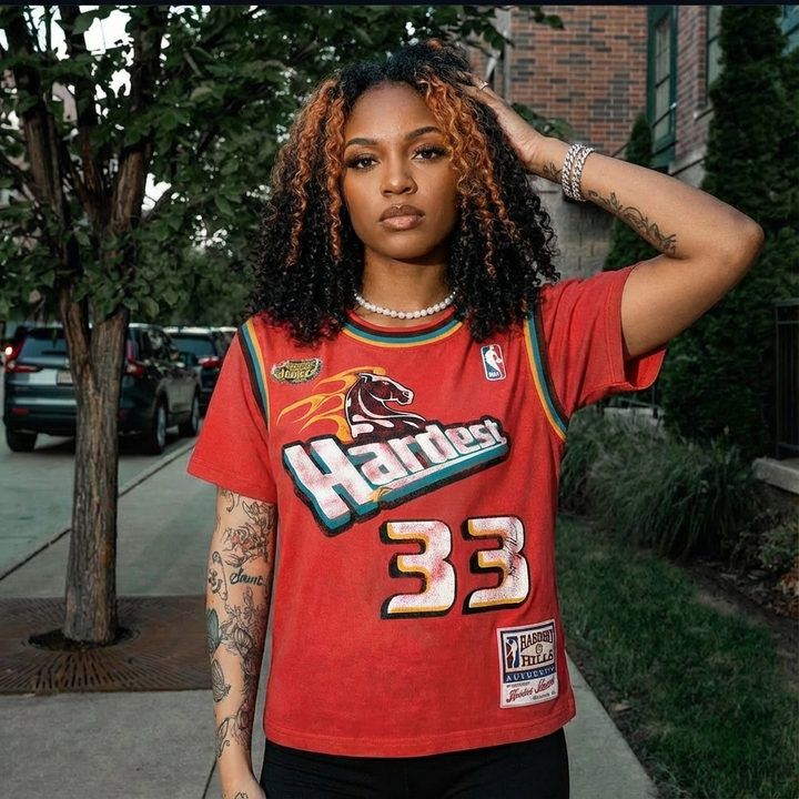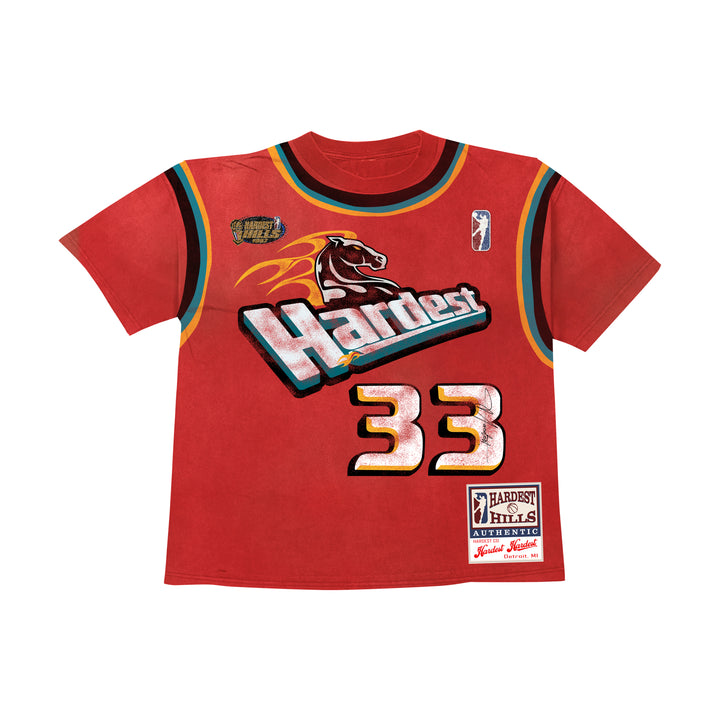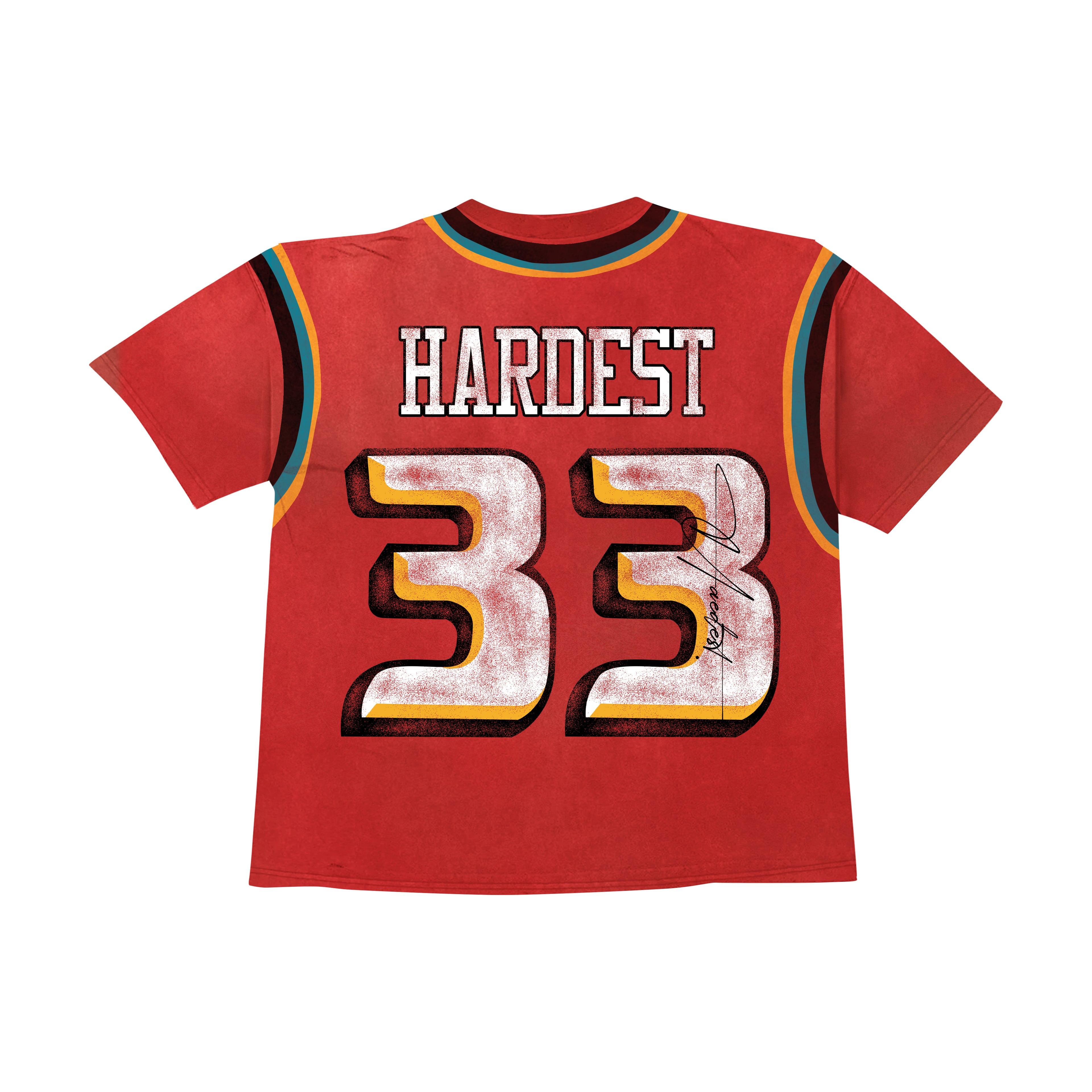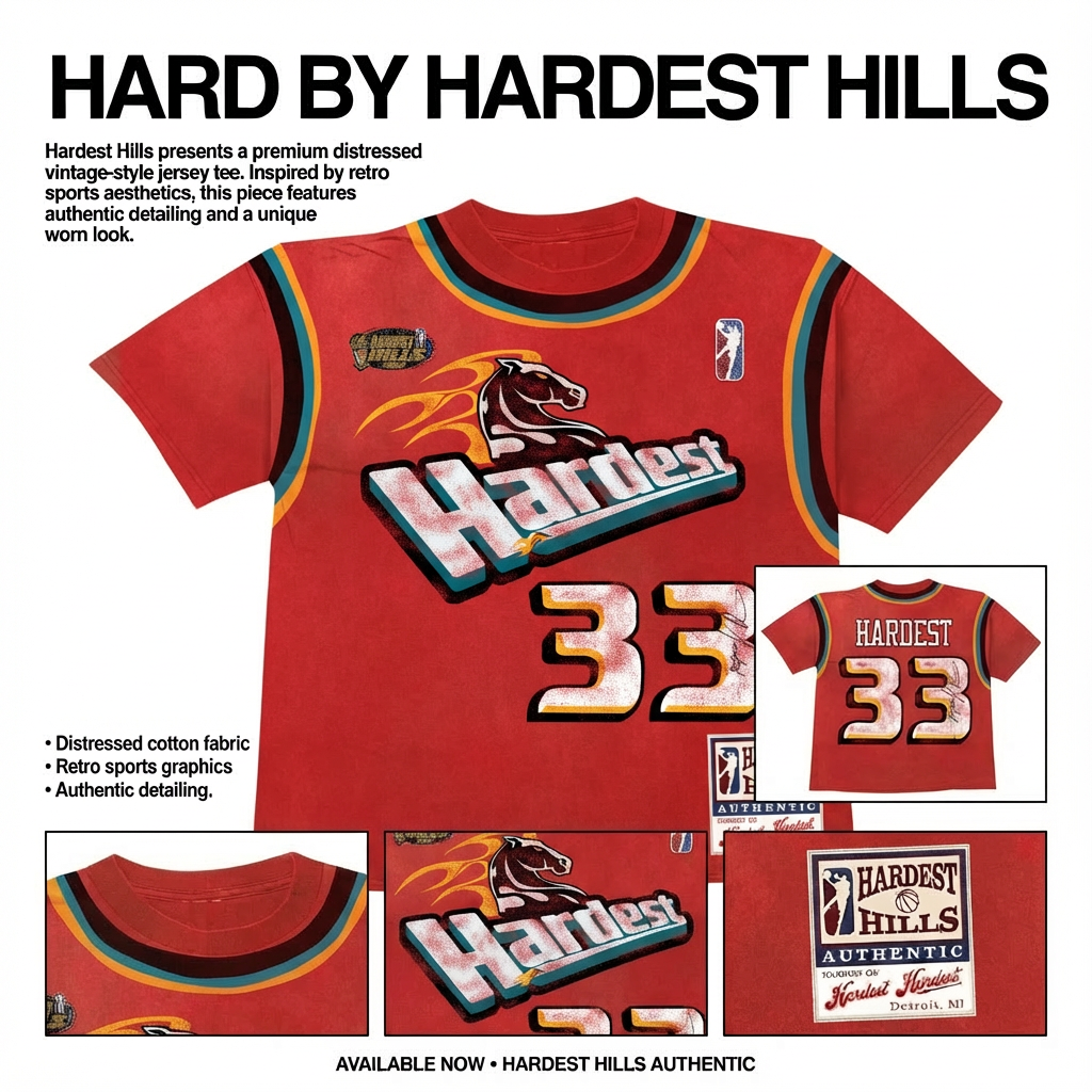 Inspired by retro sports culture and Detroit heritage, the HARD BY HARDEST HILLS Jersey Tee delivers a bold, distressed look with premium construction. This tee features a cracked vintage “Hardest” graphic across the chest, the signature 33 player number, and custom trims that channel classic on-court aesthetics.