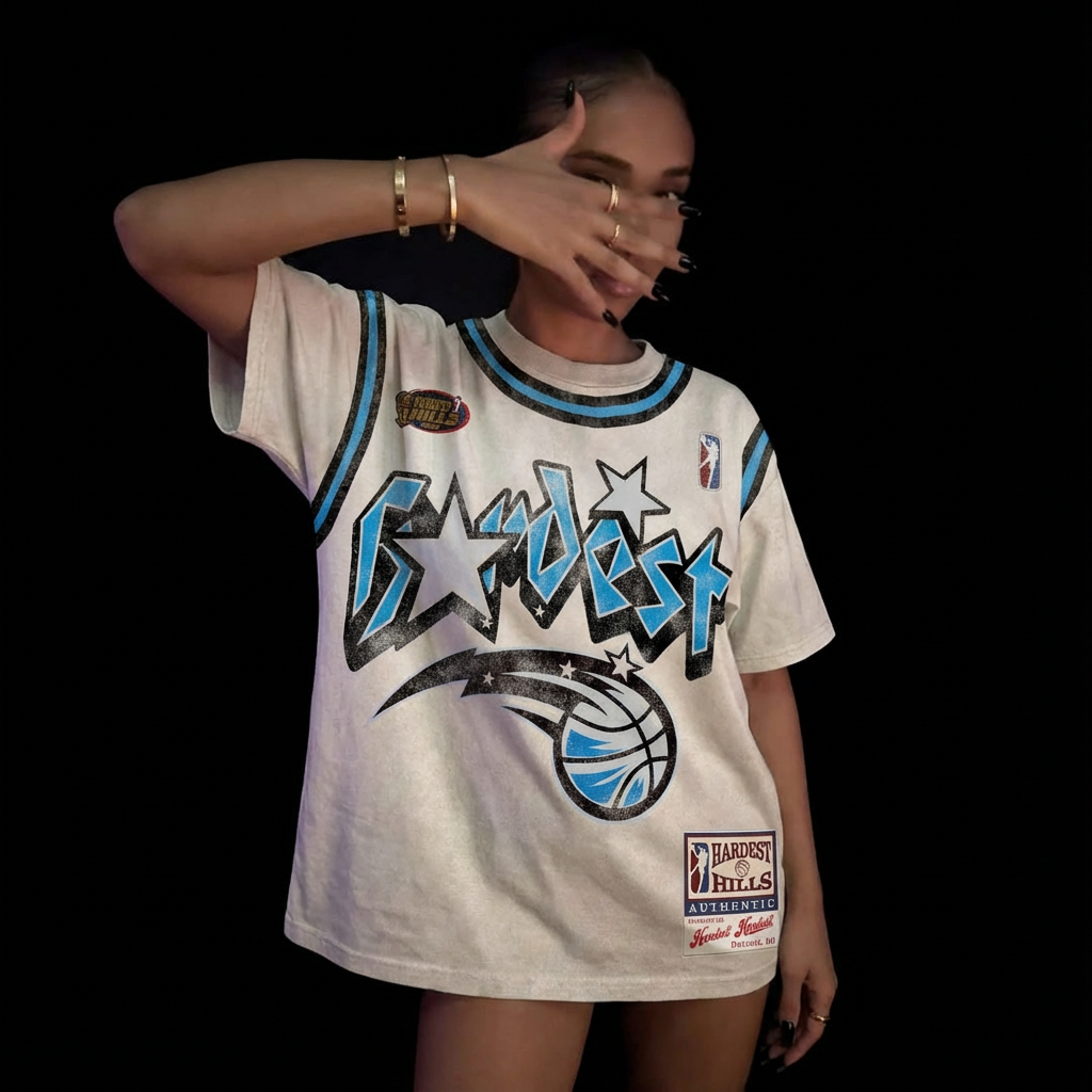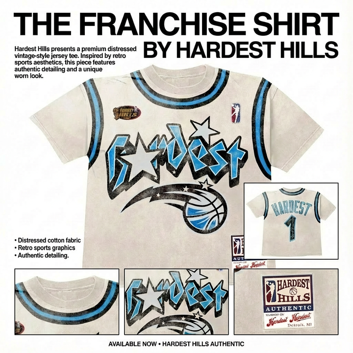 A premium distressed jersey-style tee inspired by vintage sports energy and bold retro aesthetics. The Franchise Shirt features a cracked “Hardest” graphic across the chest, electric blue accents, and classic player-style detailing throughout. A multi-tone ribbed collar gives the shirt authentic throwback character, while the back’s statement “Hardest 1” print completes the look.